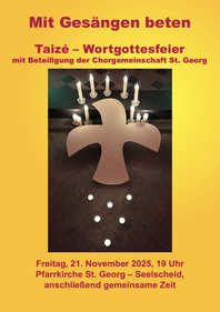 Und so laden wir alle - unabhängig von Konfession und Glauben - herzlich ein zur Taizé-Wortgottesfeier - am Freitag 21. November 2025 um 19:00 Uhr in der Pfarrkirche St. Georg in Seelscheid.