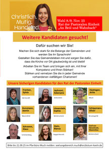 Wenn Sie für den Rat der Pastoralen Einheit kandidieren wollen, melden Sie sich bitte im >> Pastoralbüro oder beim >> Pfarrgemeinderat.