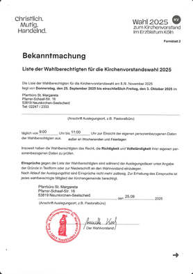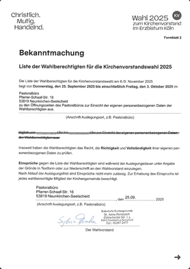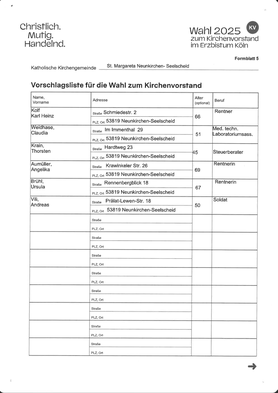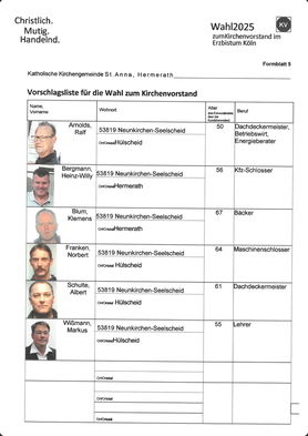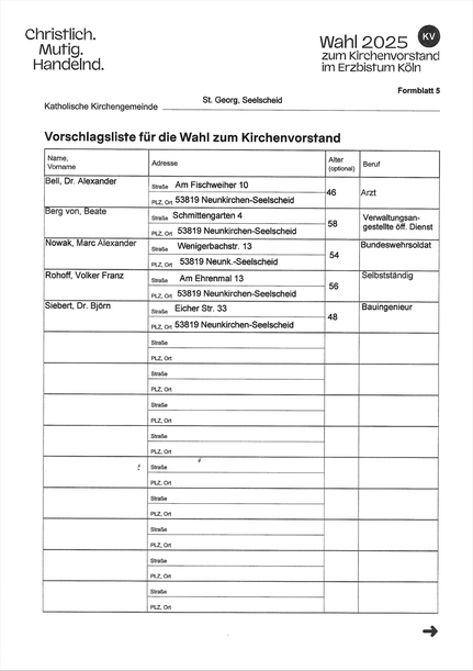 Außerdem liegen ab dem 10. März 2025 in der evangelischen Kirche in Seelscheid und in den katholischen Kirchen in Hermerath, Neunkirchen und Seelscheid die Anmeldeformulare zum Mitnehmen aus.